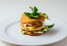 320 г • карт. оладьи, котлеты куриная, Чеддер, соус пряный, томат, салат микс