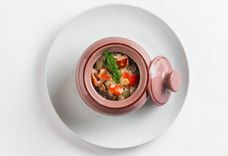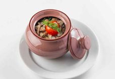 370 г • картофельные оладьи, свинина, шампиньоны, лук, сливочный соус, черри