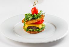 330 г • карт. оладьи, говяжья котлета, томат, Чеддер, соус,черри
