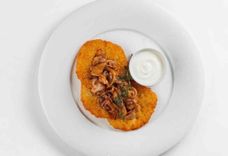 150/90/30 г • картофельные оладьи, бекон, лук, сметана