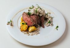 Ростбиф с грибным жульеном и печеным картофелем