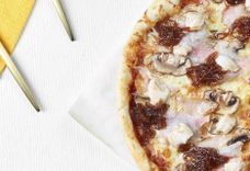 700 г • пицца с сыром моцарелла, шампиньонами, ветчиной, салями, беконом, маринованным огурцом и розмариновым маслом