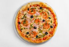 500 г • пицца с сыром моцарелла, свежими томатами, листьями салата, креветками, куриным филе, сыром пармезаном, маслинами, соусом цезарь и розмариновым маслом