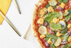 500 г • пицца с пряной свининой, сыром Чеддер, салями, огурцом конс., сметанно-чесночным соусом, луком маринованным